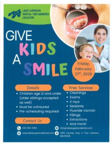 Serving children in the schools with oral hygiene instruction, cleanings, screenings, fluoride treatments and sealants. Available to children enrolled in MN or WI Medicaid, income eligible, and uninsured children within free/reduced lunch guidelines. Offered in Two Harbors and Silver Bay.